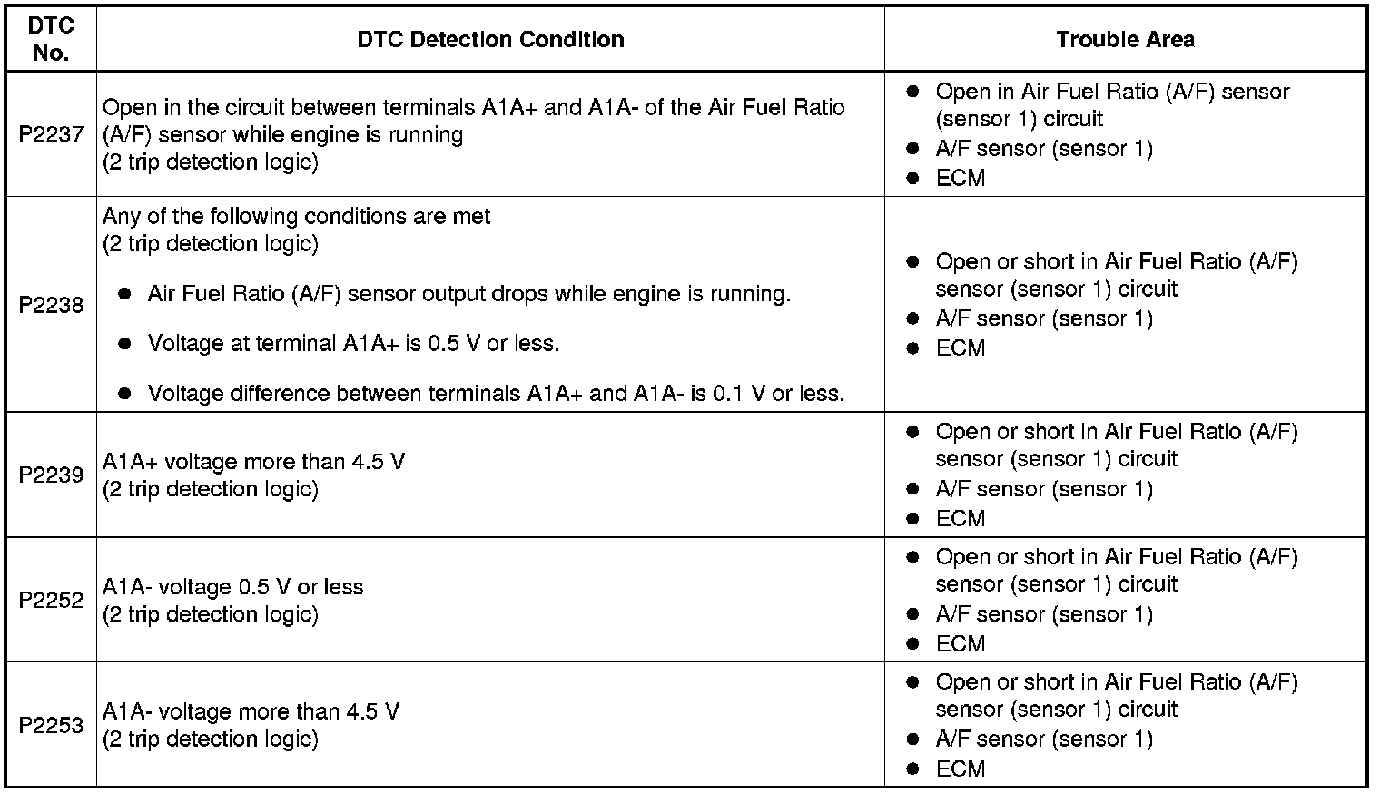 P2253 (A/F sensor short circuit between A1A- and +B):