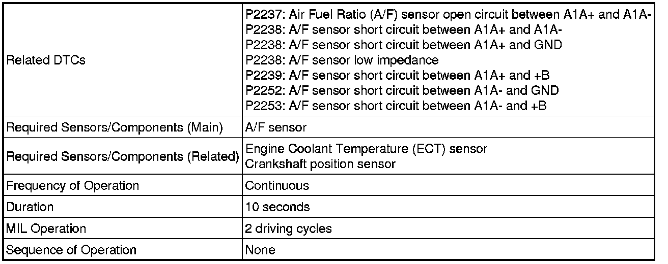 - Although the DTC titles say oxygen sensor, these DTCs relate to the Air Fuel Ratio (A/F) sensor.