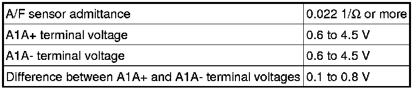 These DTCs are output when there is an open or short in the Air Fuel Ratio (A/F) sensor circuit, or if A/F sensor output drops. To detect these problems, the voltage of the A/F sensor is monitored when turning the ignition switch to the ON position, and the admittance (admittance is an electrical term that indicates the ease of flow of current) is checked while driving. If the voltage of the A/F sensor is between 0.6 V and 4.5 V, it is considered normal. If the voltage is out of the specified range, or the admittance is less than the standard value, the ECM will determine that there is a malfunction in the A/F sensor. If the same malfunction is detected in next driving cycle, the MIL will be illuminated and a DTC will be stored.