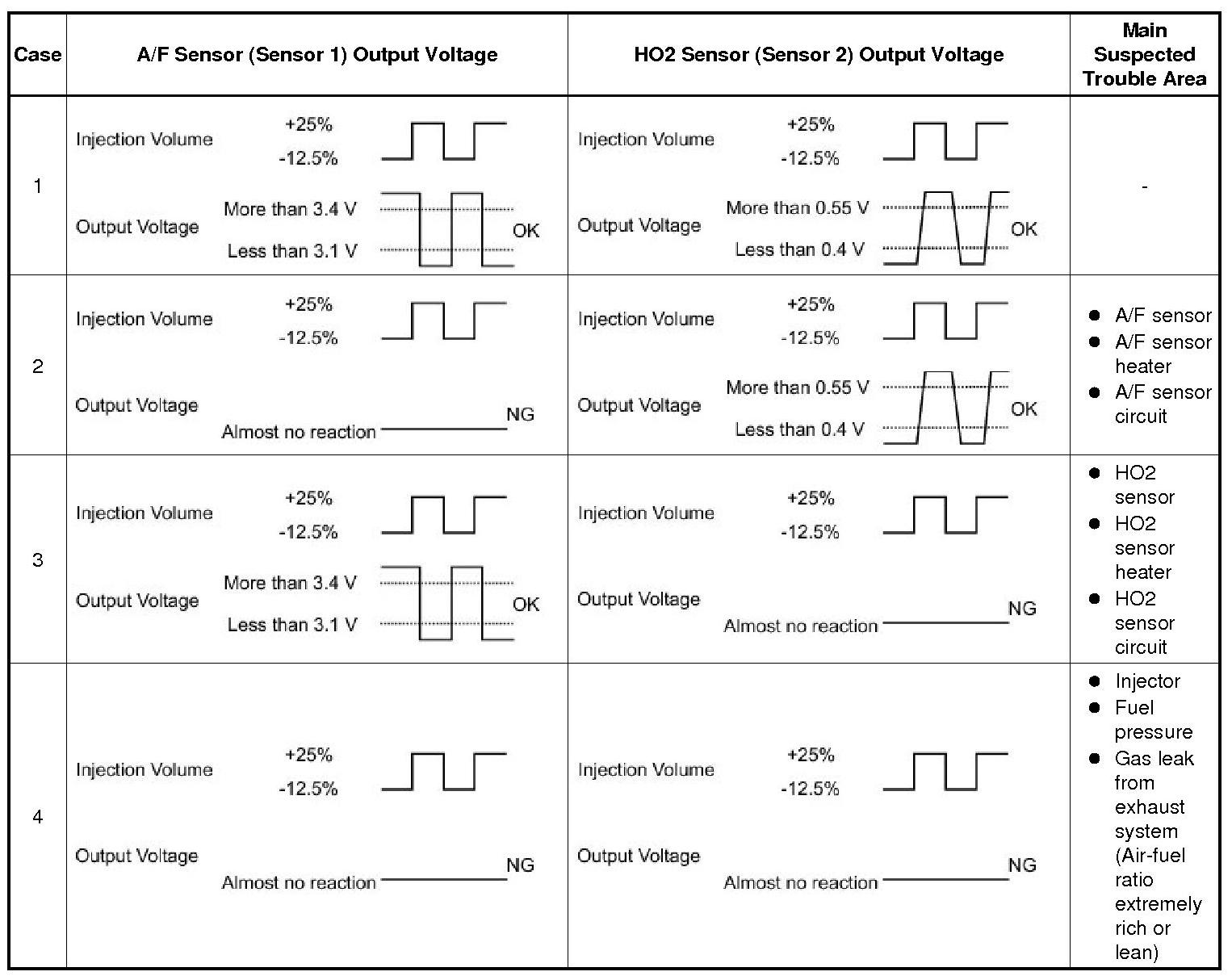 Malfunctioning areas can be identified by performing the Control the Injection Volume for A/F sensor function provided in the Active Test. The Control the Injection Volume for A/F sensor function can help to determine whether the Air Fuel Ratio (A/F) sensor, Heated Oxygen (HO2) sensor and other potential trouble areas are malfunctioning.