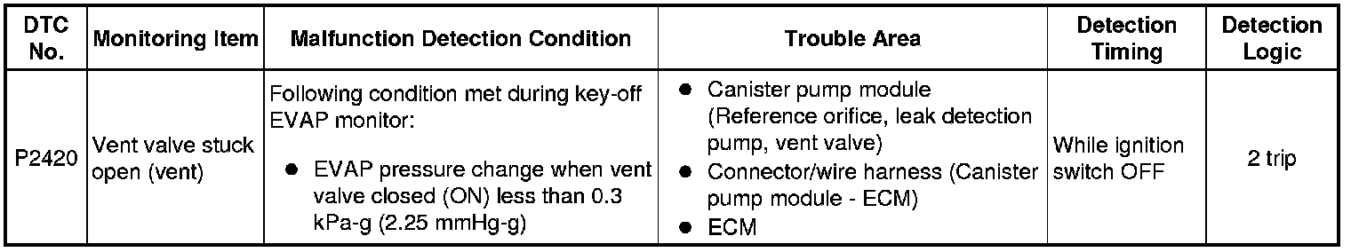 In operation C, the vent valve turns ON (closes) and the EVAP system pressure is then measured by the ECM using the canister pressure sensor to conduct an EVAP leak check. If the pressure does not increase when the vent valve is open, the ECM interprets this as the vent valve being stuck open. The ECM illuminates the MIL and sets the DTC.