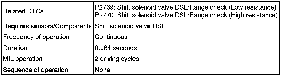 Torque converter lock-up is controlled by the ECM based on engine rpm, engine load, engine temperature, vehicle speed, transmission temperature, and shift position selection. The ECM determines the lock-up status of the torque converter by comparing the engine rpm (NE) to the input rpm (NT). The ECM calculates the actual transmission gear by comparing the input rpm (NT) to the output rpm (SPD). When conditions are appropriate, the ECM requests "lock-up" by applying control voltage to the shift solenoid valve DSL. When the shift solenoid valve DSL is opened, the shift solenoid valve DSL applies pressure to the lock-up relay valve and locks the torque converter clutch. If the ECM detects an open or short in the shift solenoid valve DSL circuit, the ECM interprets this as a fault in the shift solenoid valve DSL or its circuit. The ECM will illuminate the MIL and store a DTC.