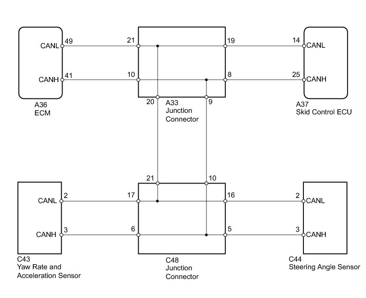 The skid control ECU receives the signals from the ECM, steering angle sensor, and yaw rate and acceleration sensor via the CAN communication system.