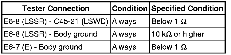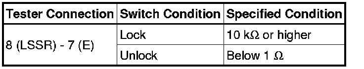 The driver side door unlock detection switch is built into the front driver's door lock. The switch turns on when the driver's door is unlocked and turns off when the door is locked. The main body ECU is connected to the front driver's door lock via terminal LSWD and driver's door lock/unlock state signals are input to the main body ECU. The main body ECU applies voltage to the door unlock detection switch via terminal LSWD. When the door unlock detection switch is off (there is continuity between the switch terminals), a lock state signal is input to the main body ECU. When the switch is on (there is no continuity between the switch terminals), an unlock state signal is input.
