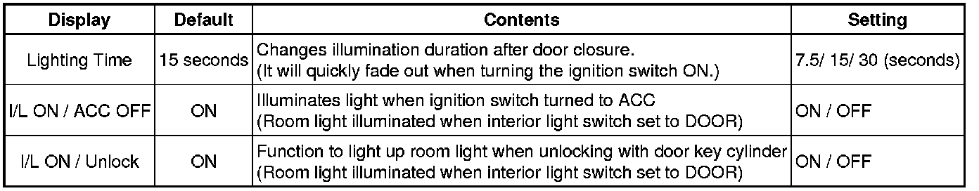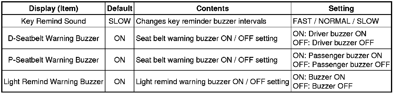 When the buzzer OFF setting is selected, the buzzer activation while the vehicle is being driven is cancelled. However, the buzzer activation when the ignition switch is turned to ON cannot be cancelled.