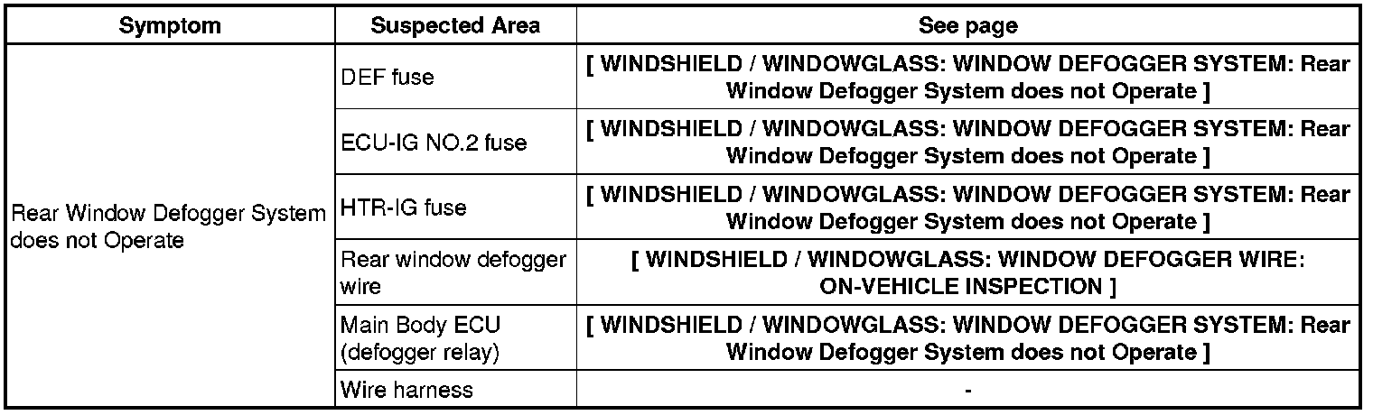 / WINDOWGLASS: WINDOW DEFOGGER SYSTEM: PROBLEM SYMPTOMS TABLE