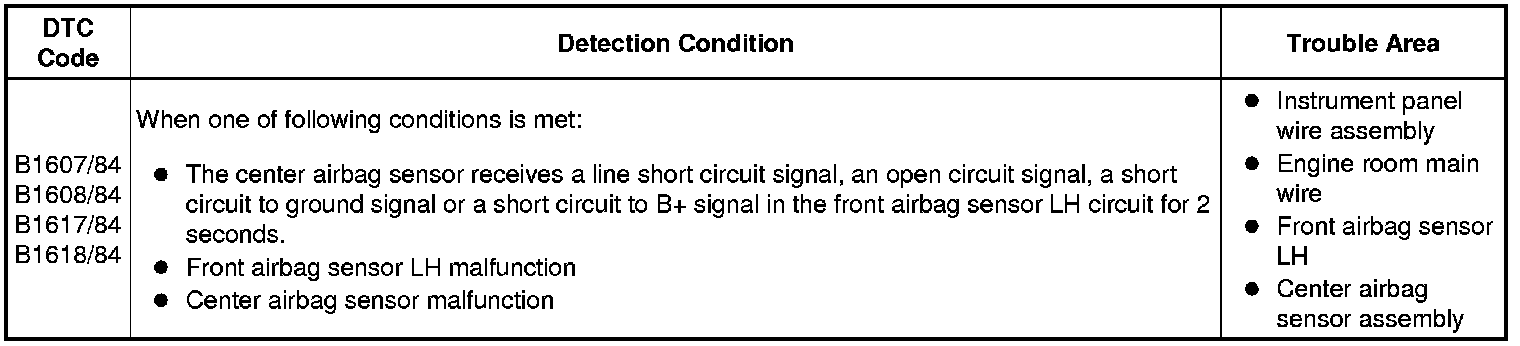 DTC B1607/84, B1608/84, B1617/84 or B1618/84 is recorded when a malfunction is detected in the front airbag sensor LH circuit.