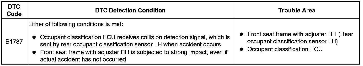 DTC B1787 is also set when the front seat frame with adjuster RH is subjected to a strong impact, even if an actual accident has not occurred.