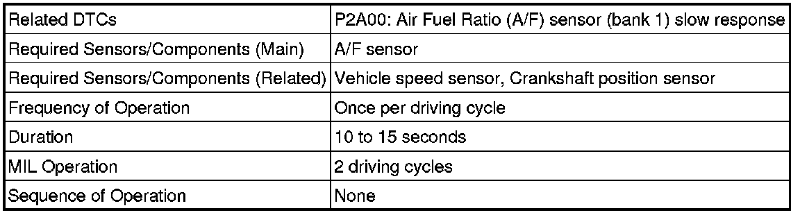 The Air Fuel Ratio (A/F) sensor has an output delay of a few seconds and the Heated Oxygen (HO2) sensor has a maximum output delay of approximately 20 seconds.