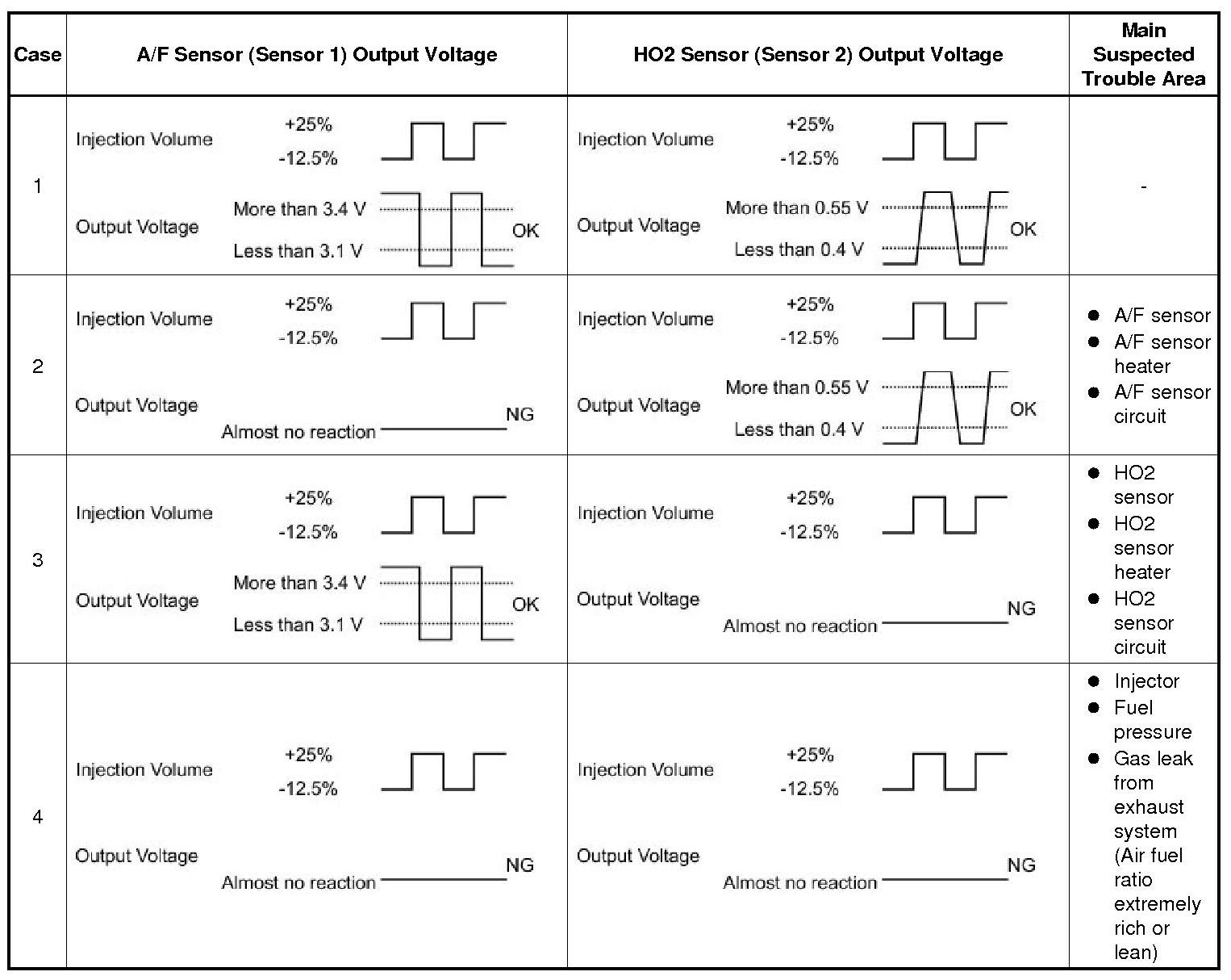 Malfunctioning areas can be identified by performing the Control the Injection Volume for A/F sensor function provided in the Active Test. The Control the Injection Volume for A/F sensor function can help to determine whether the Air Fuel Ratio (A/F) sensor, Heated Oxygen (HO2) sensor and other potential trouble areas are malfunctioning.