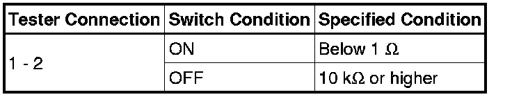 (a) Measure the resistance between terminals 1 and 2 of the tire pressure warning reset switch when the tire pressure warning switch is ON and OFF.