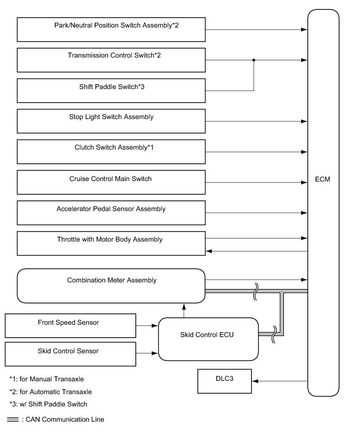 The ECM cancels cruise control when the shift lever is moved from D or S to a position other than D or S, when the 3rd, 2nd or 1st range is selected with the shift lever in S, or when the 3rd, 2nd or 1st range is selected using the paddle switches with the shift lever in D.