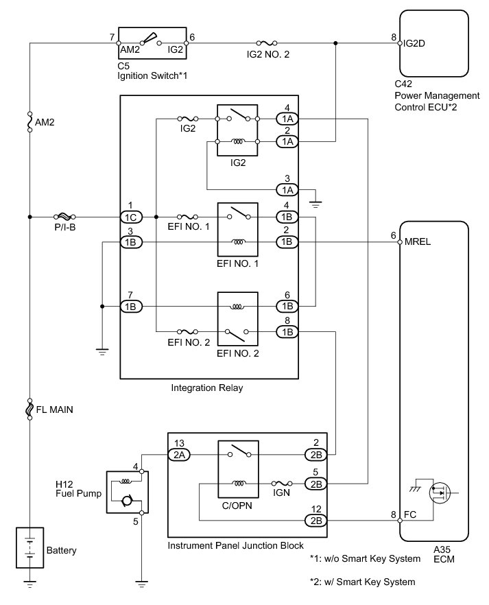 When the engine is cranked, the starter relay drive signal output from the ignition switch*1 or power management control ECU*2 is input into the STA terminal of the ECM, and the NE signal generated by the crankshaft position sensor is input into the NE+ terminal. The ECM determines that the engine is cranked, and turns transistor Tr1 in the ECM internal circuit on. Current flows to the C/OPN (Circuit Opening) relay by turning Tr1 on.