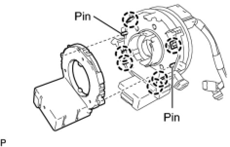 (a) Engage the 6 claws and insert the 2 pins into the holes to install the steering angle sensor onto the spiral cable.