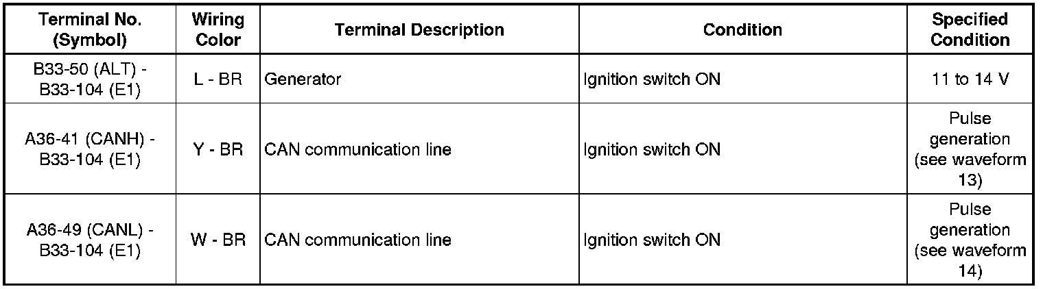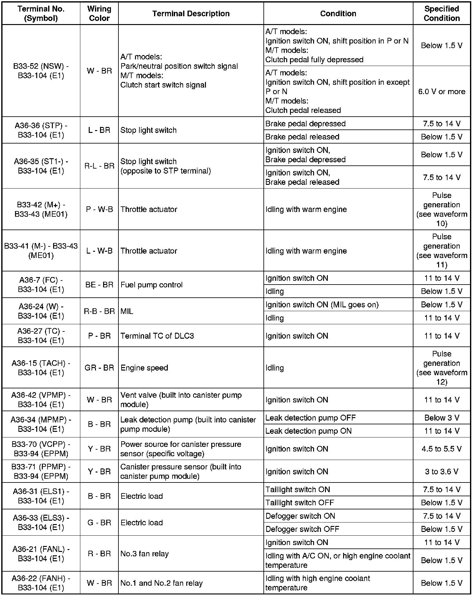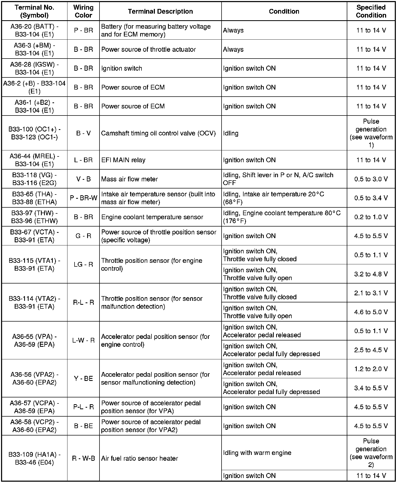 The standard normal voltage between each pair of ECM terminals is shown in the table below. The appropriate conditions for checking each pair of terminals are also indicated. The result of checks should be compared with the standard normal voltage for that pair of terminals, displayed in the Specified Condition column. The illustration above can be used as a reference to identify the ECM terminal locations.