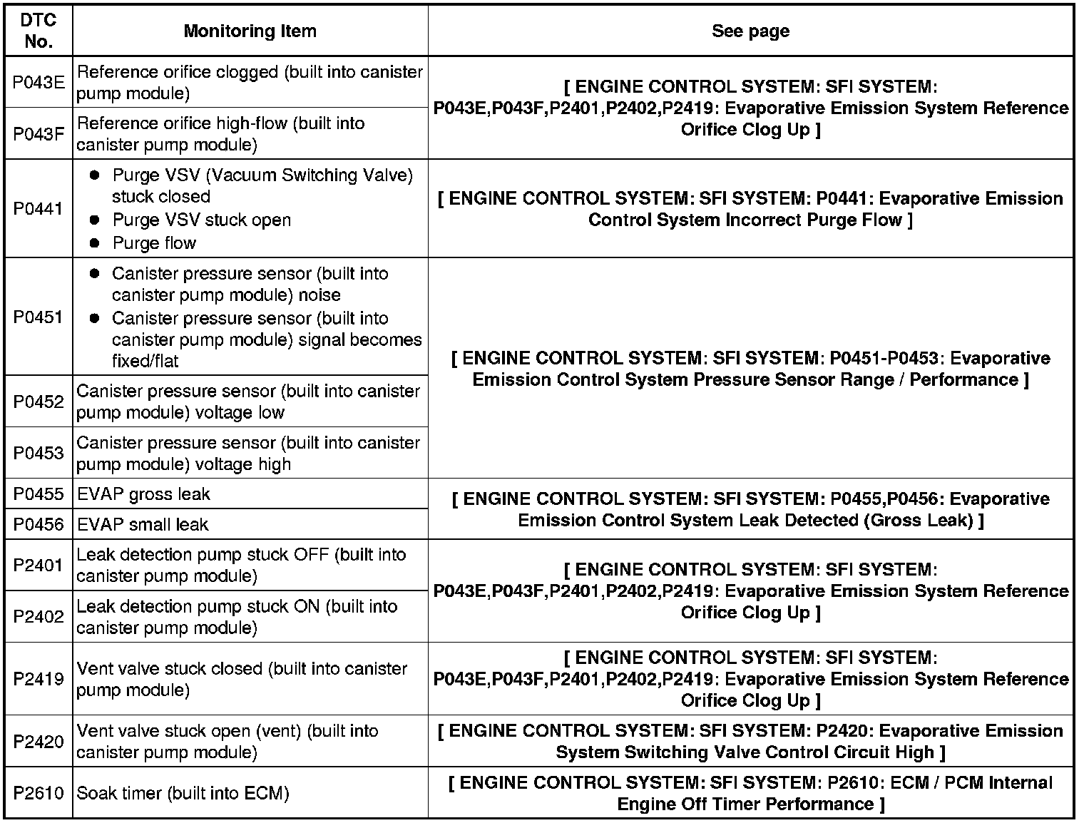 The leak detection pump creates negative pressure (vacuum) in the EVAP system and the pressure is measured. Finally, the ECM monitors for leaks from the EVAP system, and malfunctions in both the canister pump module and purge VSV, based on the EVAP pressure.