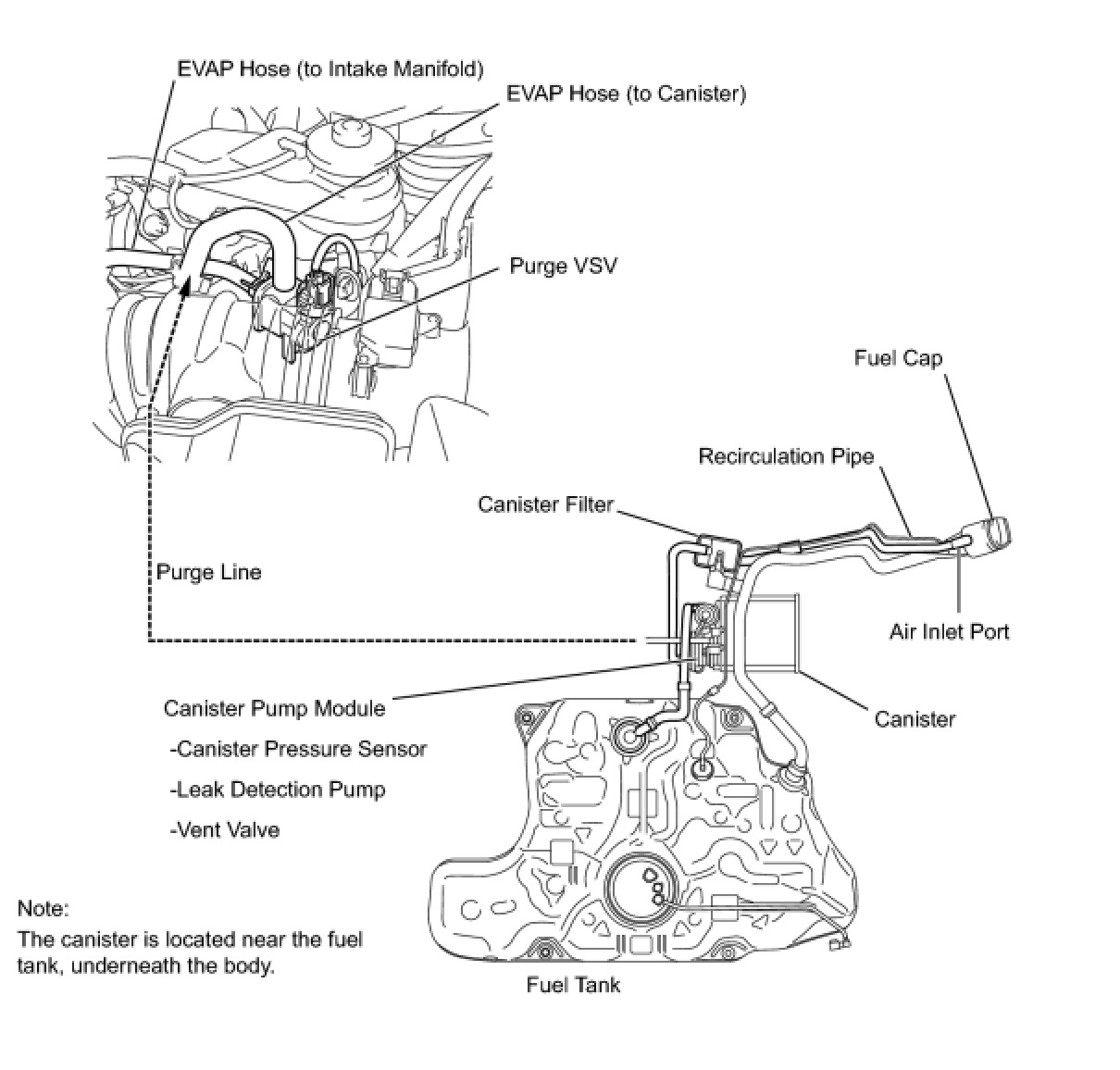 While the engine is running, if a predetermined condition (closed-loop, etc.) is met, the purge VSV is opened by the ECM and stored fuel vapors in the canister are purged into the intake manifold. The ECM changes the duty cycle ratio of the purge VSV to control purge flow volume.