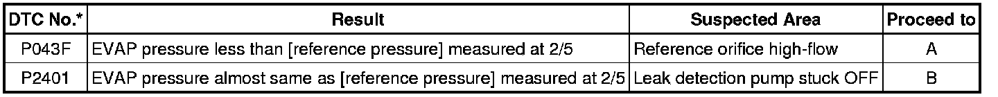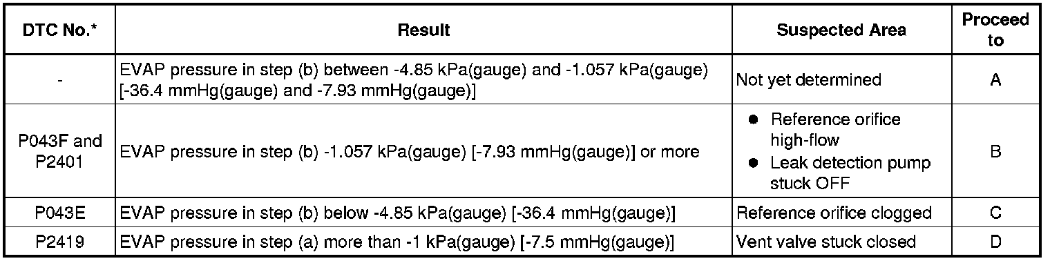 If the reference pressure difference between the first and second checks is greater than the specification, all the DTCs relating to the reference pressure (P043E, P043F, P2401, P2402 and P2419) are stored.