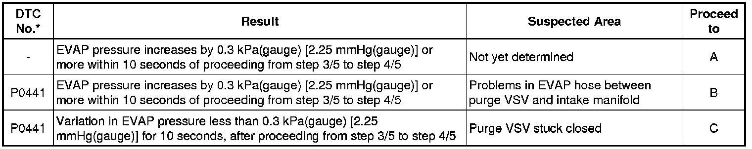 The vent valve is turned ON (closed) and the EVAP pressure is measured. If the variation in the pressure is less than 0.4 kPa(gauge) [3.0 mmHg(gauge)], the ECM interprets this as the purge VSV being stuck closed, and illuminates the MIL and stores DTC P0441 (2 trip detection logic).