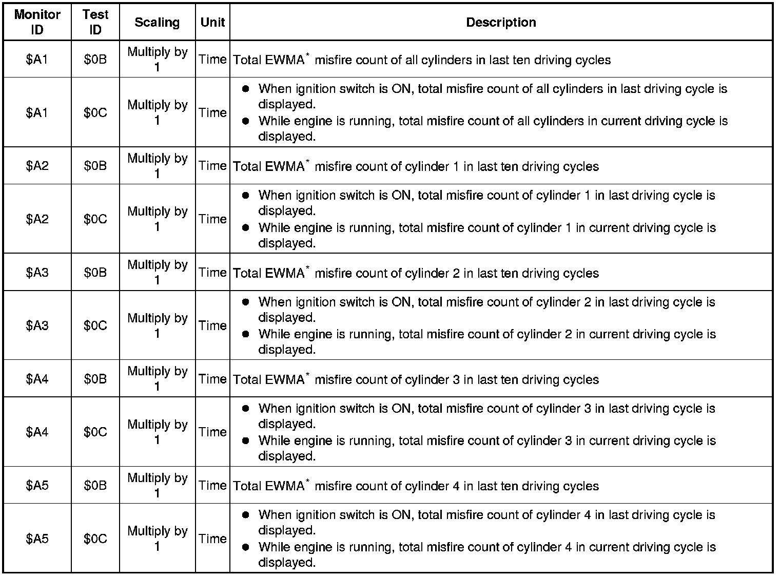 *: EWMA (Exponential Weighted Moving Average) misfire counts for last 10 driving cycles (calculated) Calculation: