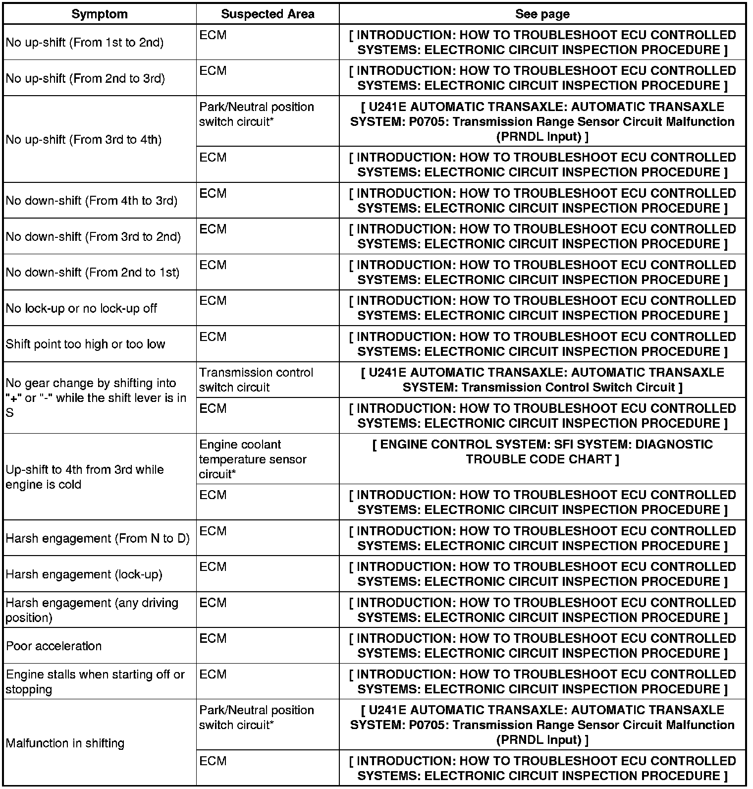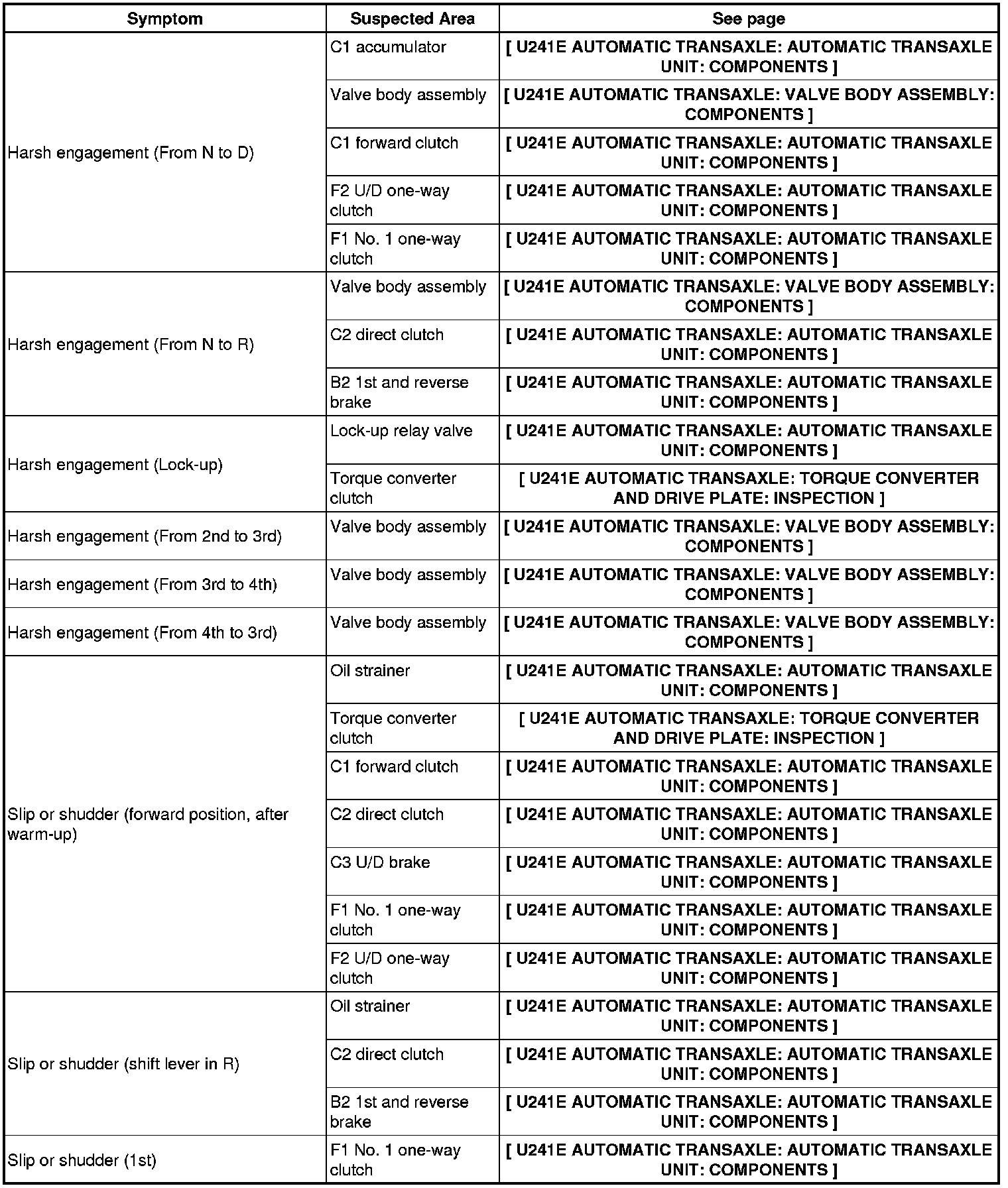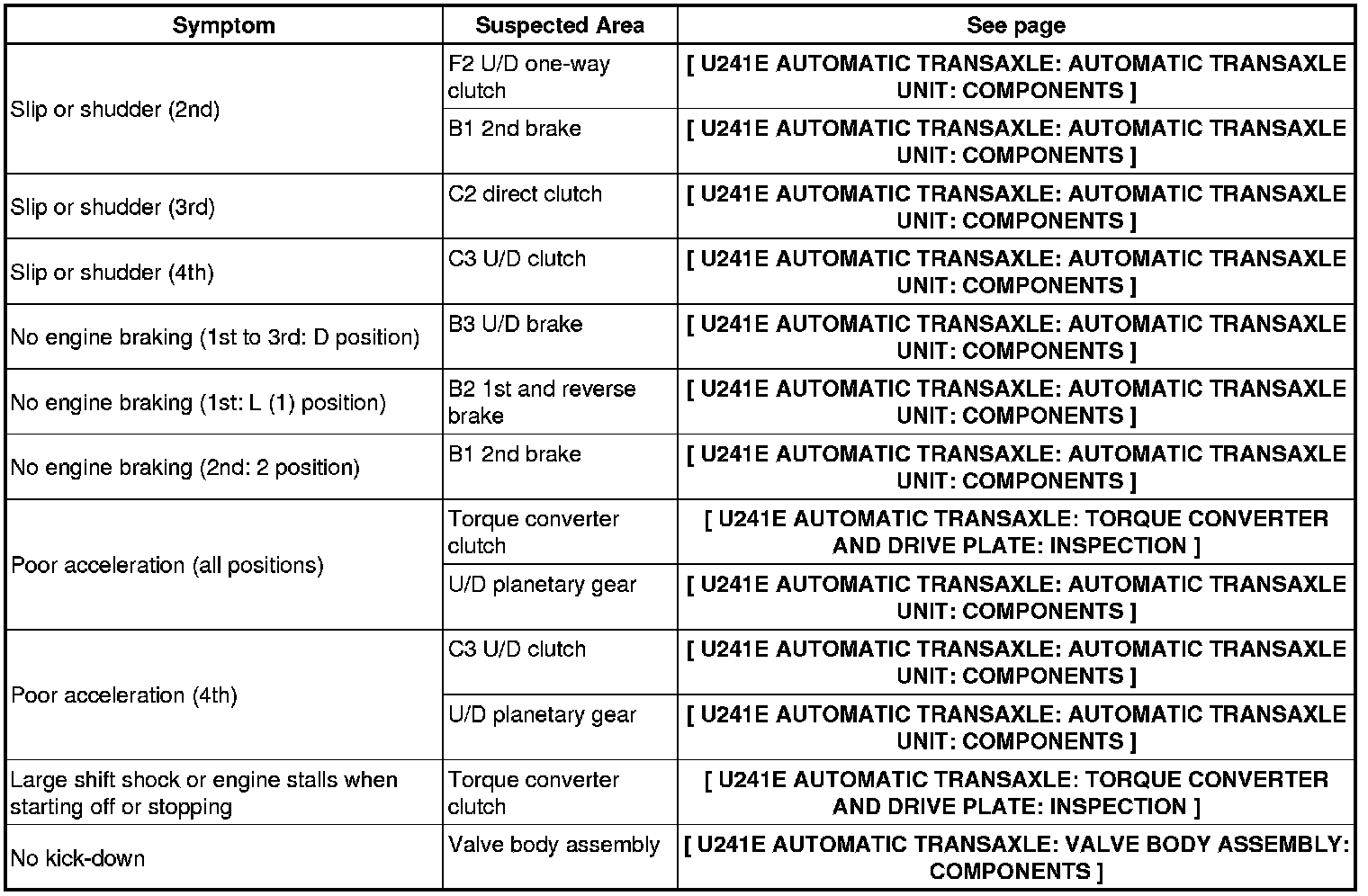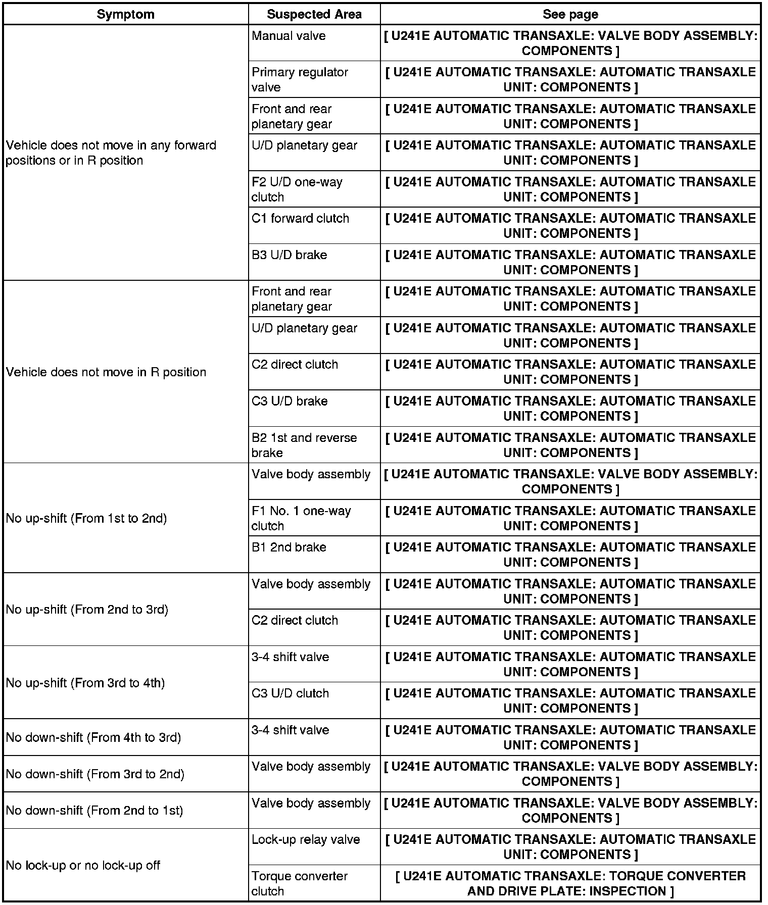 U241E AUTOMATIC TRANSAXLE: AUTOMATIC TRANSAXLE SYSTEM: PROBLEM SYMPTOMS TABLE