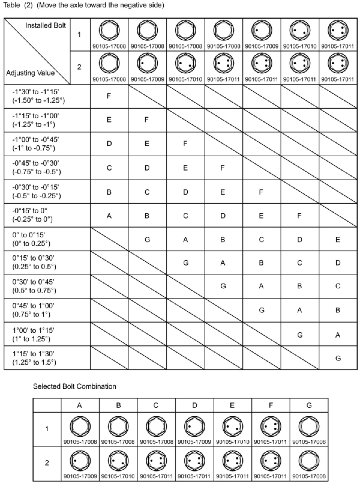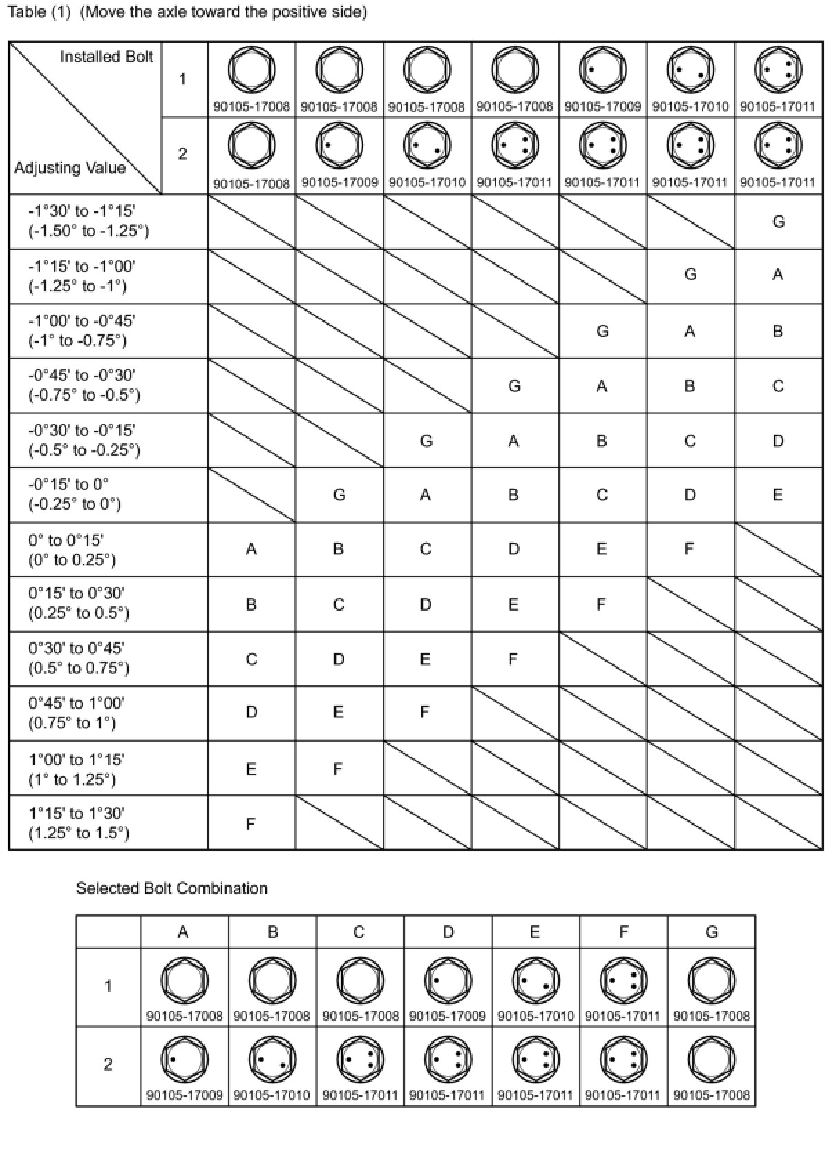 Check the combination of installed bolts. Select appropriate bolts from the table below to adjust the camber to the specified values.