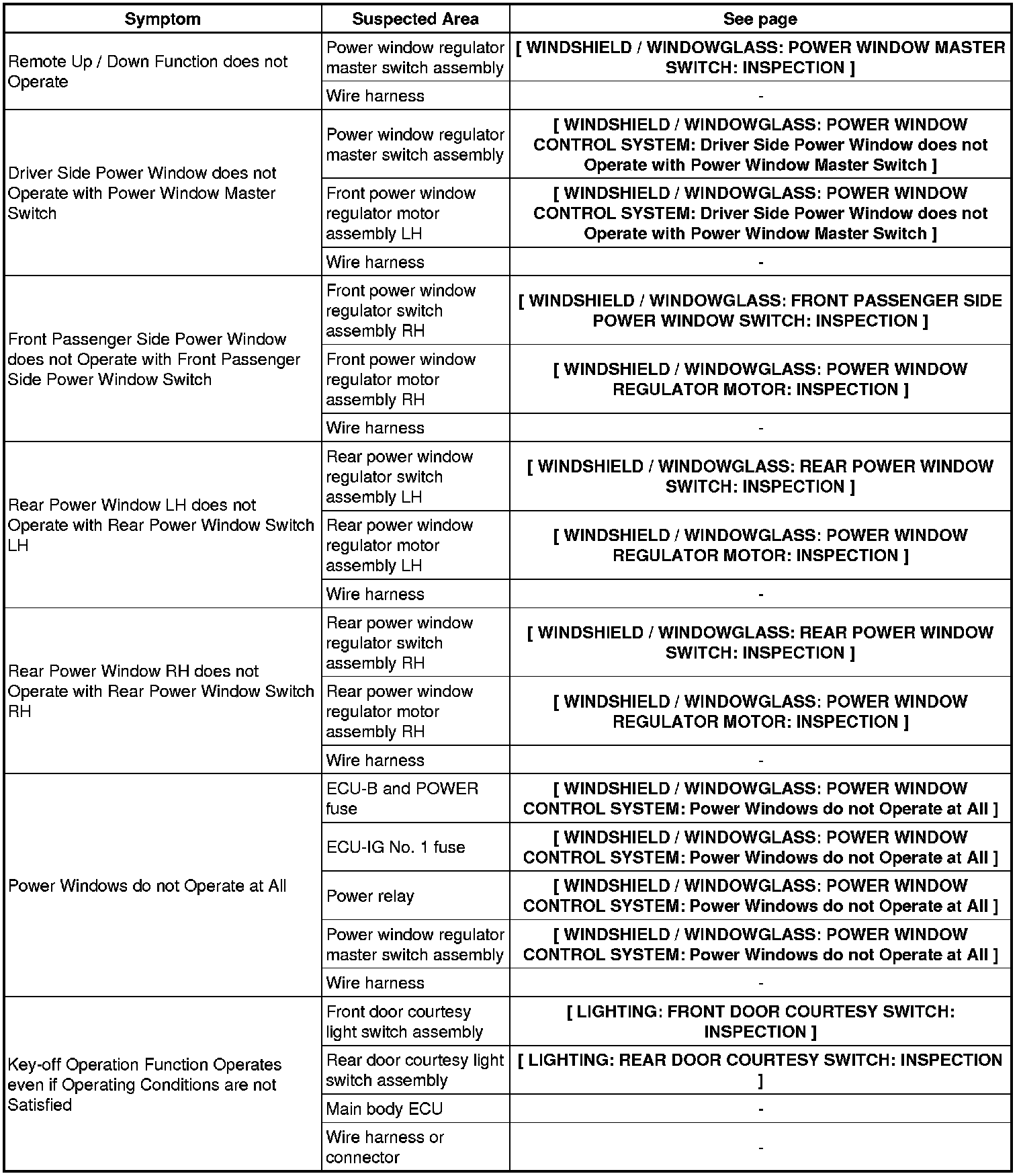 WINDSHIELD / WINDOWGLASS: POWER WINDOW CONTROL SYSTEM: PROBLEM SYMPTOMS TABLE