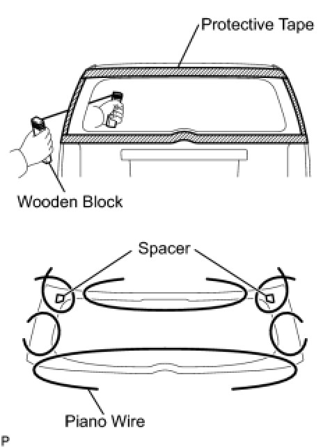 (c) From the interior, insert piano wires between the vehicle body and back door glass, as shown in the illustration.
