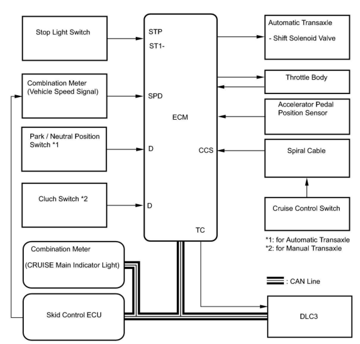 * The ECM cancels the cruise control system when the shift lever is moved from the D or 3 position to the N, 2 or L position. (for AUTOMATIC TRANSAXLE)