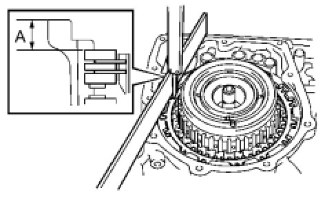 (a) As shown in the illustration, place a straight edge on the transaxle case and measure the distance between the 2nd coast and O/D brake flange and straight edge using vernier calipers. (Dimension A)