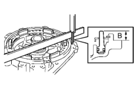 (b) As shown in the illustration, place a straight edge on the O/D brake piston and measure the distance between the transaxle rear cover and straight edge using vernier calipers. (Dimension B)