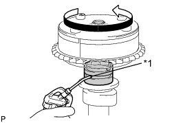 (3) While applying approximately 150 kPa (1.5 kgf/cm2, 22 psi) of air pressure to the oil paths, forcibly turn the camshaft timing gear in the advance direction (counterclockwise).