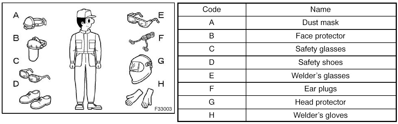 1. In addition to the usual mechanic's wear, cap and safety shoes, the appropriate gloves, head protector, welder's glasses, ear plugs, face protector, dust mask, etc. should be worn as the situation demands.