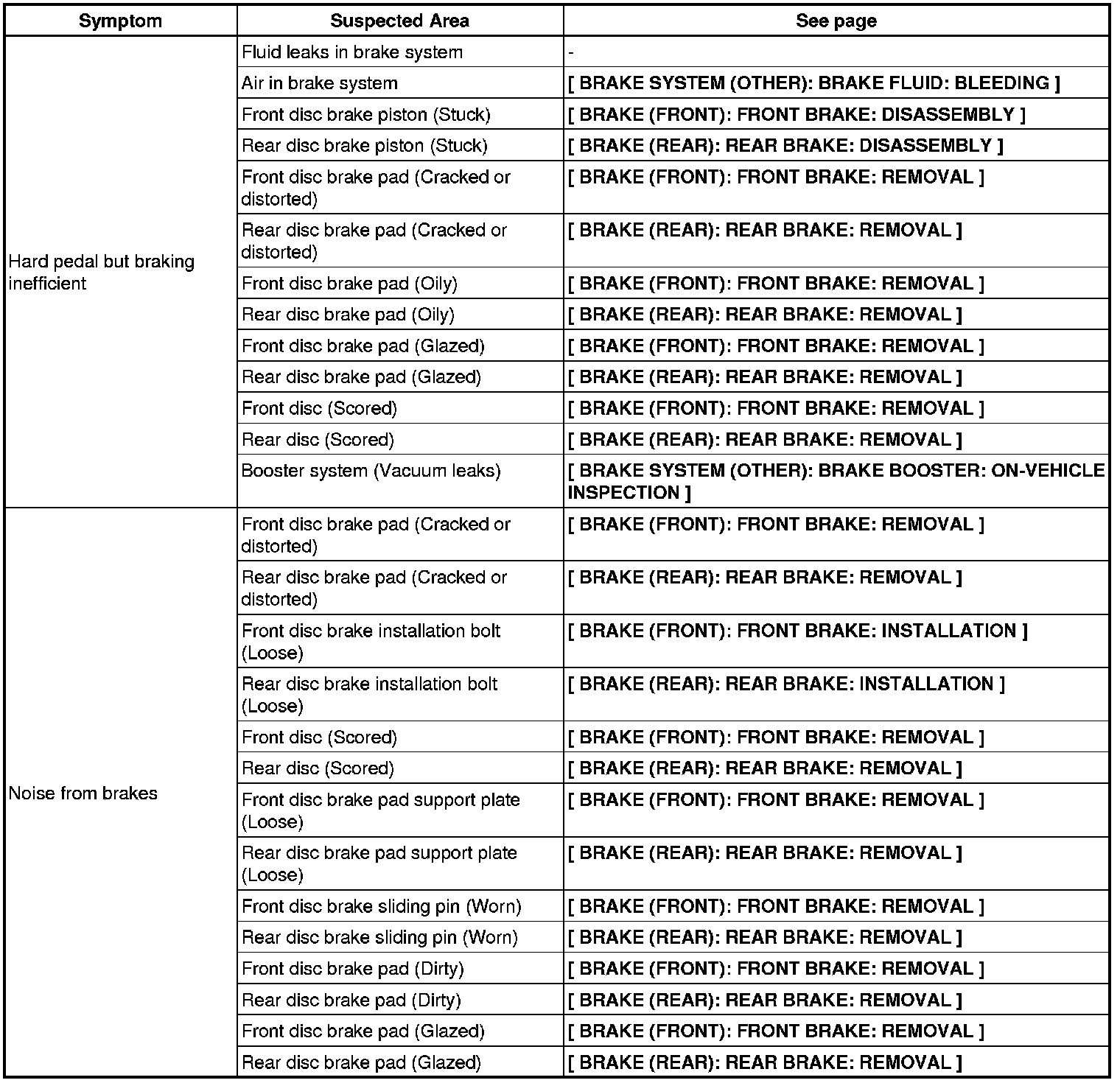 BRAKE SYSTEM (OTHER): BRAKE SYSTEM: PROBLEM SYMPTOMS TABLE