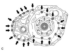 (b) Using a brass bar and hammer, tap on the circumference of the transaxle housing to remove the transaxle housing from the transaxle case.