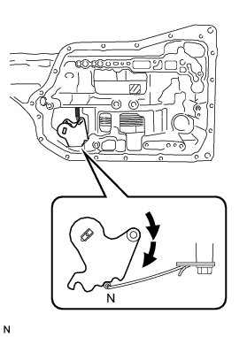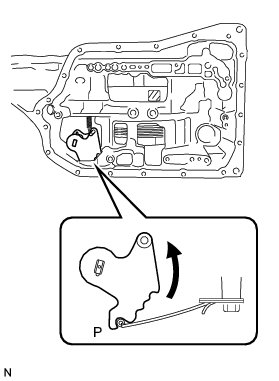 (a) Turn the manual valve lever shaft counterclockwise to set it to the P position as shown in the illustration.
