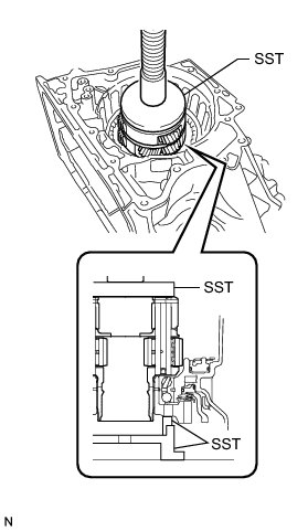 (b) Place SST on the 1st and reverse brake return spring and compress the 1st and reverse brake return spring with a press.
