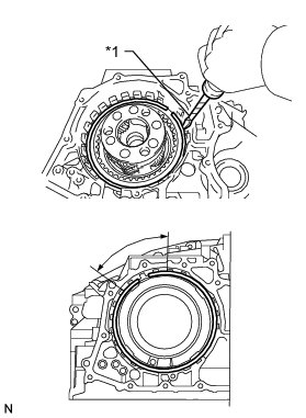 * Make sure to align the protruding part of the snap ring with the indented part (#1) of the oil pump and gear body assembly shown in the illustration to install the snap ring.