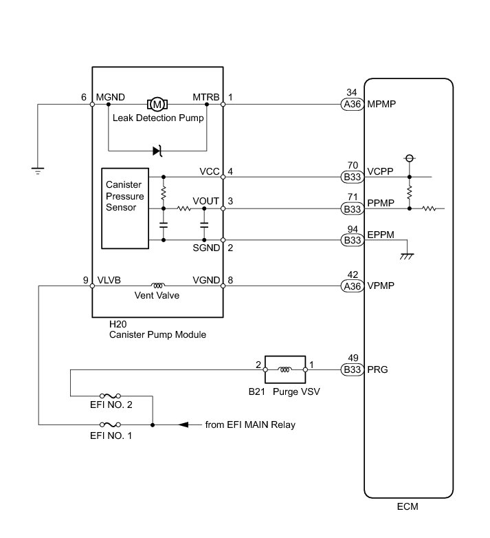 The leak detection pump creates negative pressure (vacuum) in the EVAP system and the pressure is measured. Finally, the ECM monitors for leaks from the EVAP system, and malfunctions in both the canister pump module and purge VSV based on the EVAP pressure.