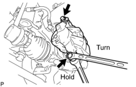 (a) Hold the slide pin with a wrench and install the disc brake cylinder onto the disc brake cylinder mounting with the 2 bolts.