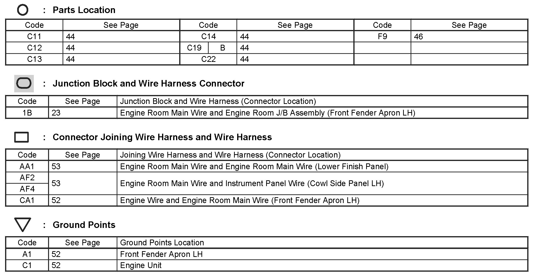 Locations: The locations of components, connectors, ground points, and splices referred to within these diagrams can be found at Vehicle Locations. Locations