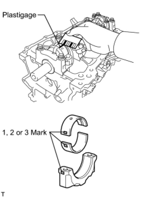 If replacing a bearing, replace it with one that has the same number as its respective connecting rod cap. Each bearing's standard thickness is indicated by a 1, 2, or 3 mark on its surface.