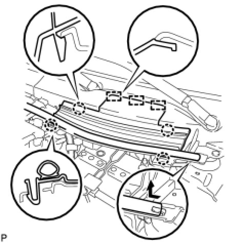 (b) Disengage the 4 claws and 3 guides and remove the cowl top ventilator louver center.