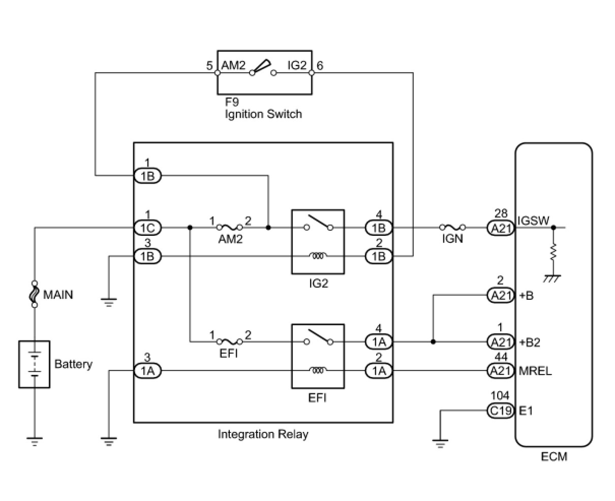 When the ignition switch is turned to ON, the battery voltage is applied to the IGSW terminal of the ECM. The output signal from the MREL terminal of the ECM causes a current to flow to the EFI relay coil, closing the EFI relay contacts and supplying power to terminal +B of the ECM.