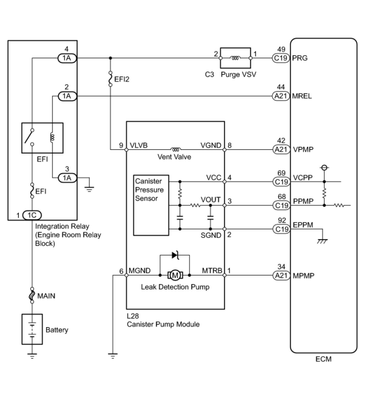 The leak detection pump creates negative pressure (vacuum) in the EVAP system and the pressure is measured. Finally, the ECM monitors for leaks from the EVAP system, and malfunctions in both the canister pump module and purge VSV based on the EVAP pressure.