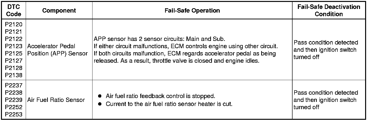 If any of the following DTCs are stored, the ECM enters fail-safe mode to allow the vehicle to be driven temporarily or stops fuel injection.