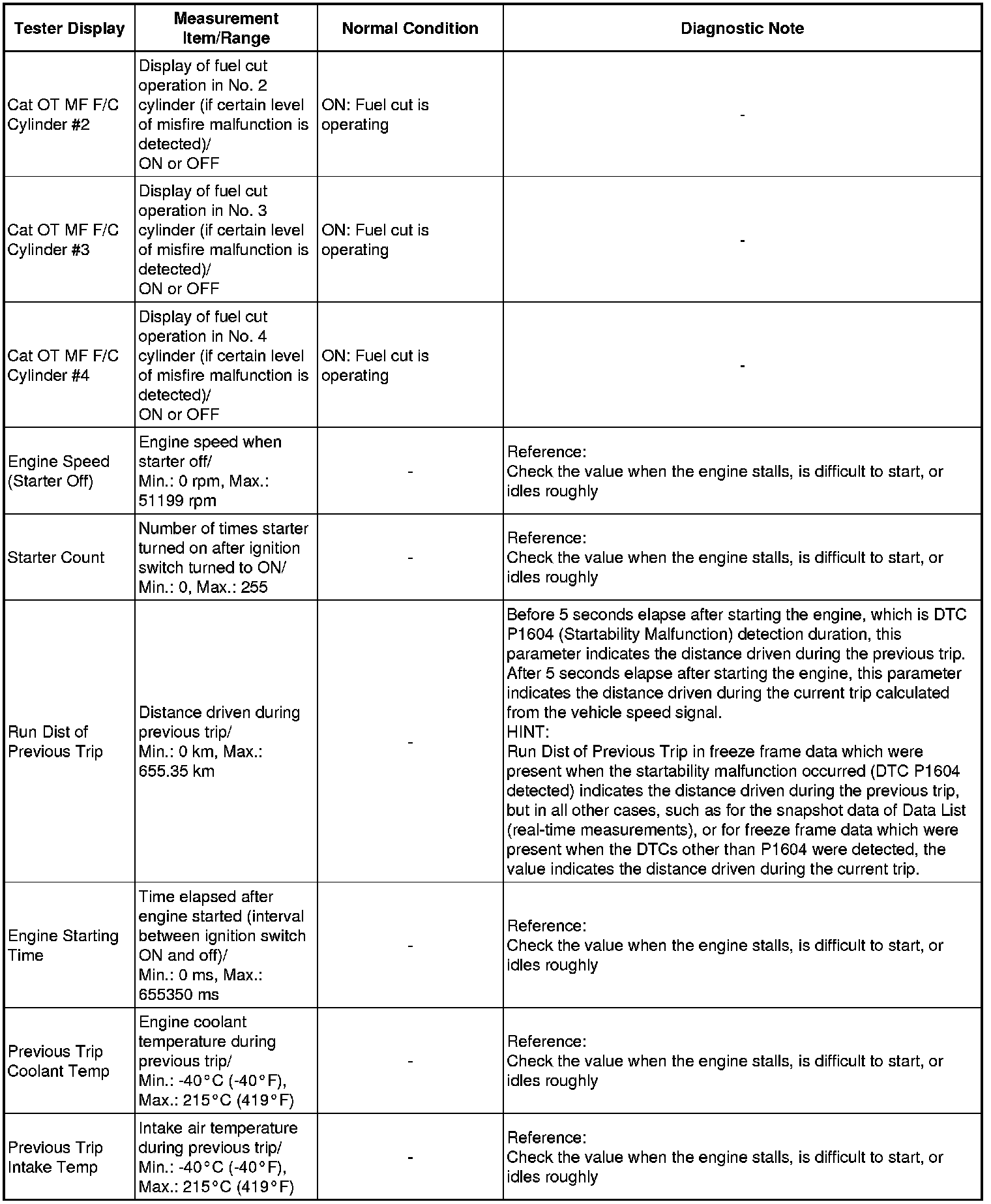 At first, the Techstream displays extremely high cylinder engine speed values. After approximately 10 seconds of engine cranking, each cylinder engine speed measurement will change to the actual engine speed.