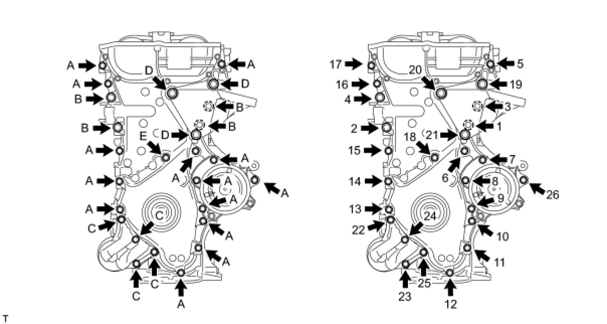 Install the timing chain cover with the 19 bolts as shown in the illustration.