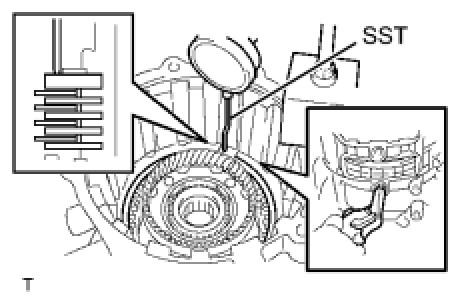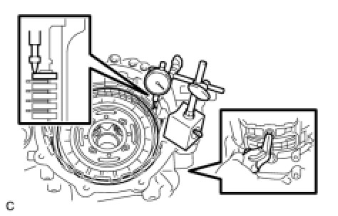 (a) Using SST and a dial indicator, measure the first and reverse brake clearance while pressing the disc and plate from the rear side.