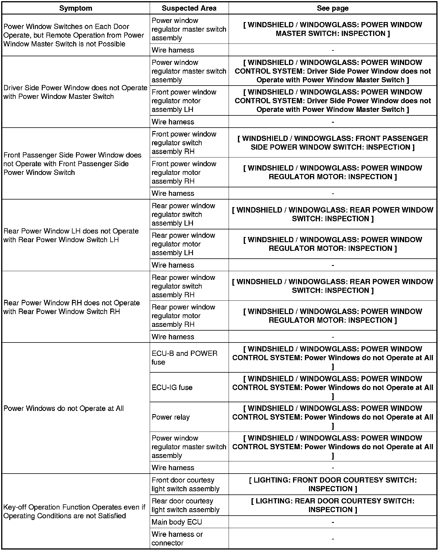 WINDSHIELD / WINDOWGLASS: POWER WINDOW CONTROL SYSTEM: PROBLEM SYMPTOMS TABLE